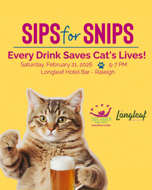 Join us for Sips for Snips at The Longleaf Hotel on Saturday, February 21, from 5-7 PM! Enjoy craft cocktails while learning about our adoptable cats in a fun, relaxed atmosphere.